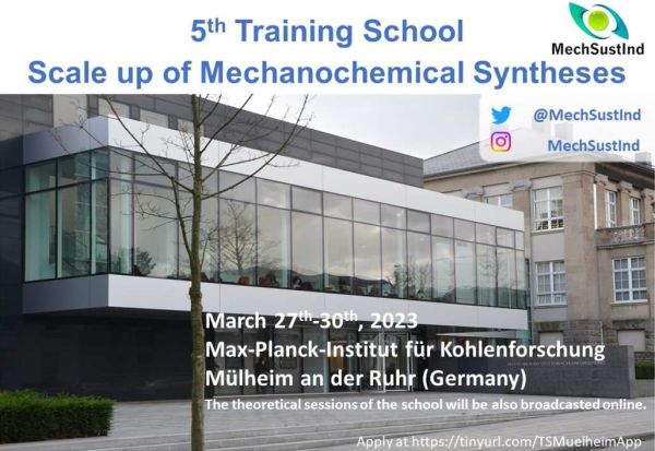 Training Schools are organized by CA18112 MechSustInd Action on research topics relevant for mechanochemistry and provide dissemination opportunities for Action activities. Training Schools provide intensive training sessions within the laboratories and organizations involved in the Action. Participants are mainly, but not exclusively, young researchers involved in the Action